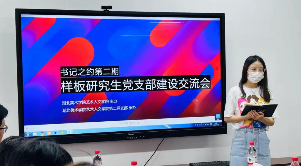 接着艺术人文学院学生第二党支部书记辛宇介绍了我院党支部的基本情况以及近期举办的活动。环艺系学生副书记覃爱灵和纪检委员傅凯分享了如何创建样板党支部的经验。版画系学生副书记胡雪珂介绍了他们支部与尚艺实践队共同举办的红色主题展览。视觉艺术组织委员邓璇和宣传委员张和雨介绍了他们支部对于积极分子的培养方式以及奖惩措施等。