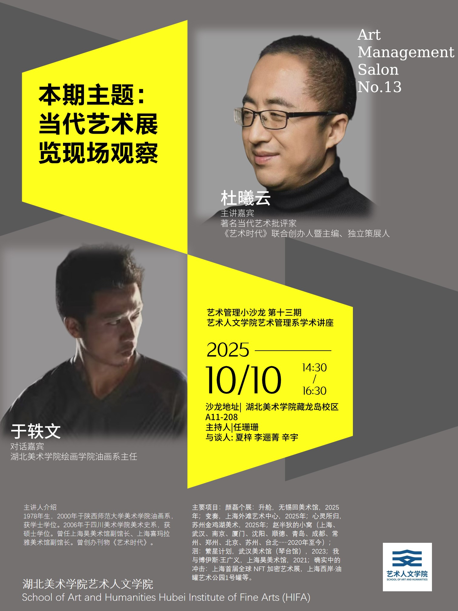 2025年10月10日下午2:30,艺术人文学院第十三期艺管小沙龙在A11-209教室顺利举行。本期沙龙特邀著名当代艺术批评家、《艺术时代》联合创办人暨主编、独立策展人杜曦云先生,以及湖北美术学院绘画学院油画系主任于轶文老师担任主讲,围绕“当代艺术展览现场观察”主题展开深度分享。艺术管理系主任任珊珊副教授主持本次活动,夏梓、辛宇、李逦菁参与对谈,艺术管理系2022级本科生参与交流。