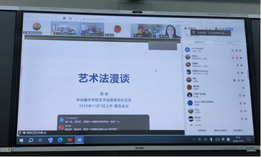 2025年11月7日(星期五)上午9时30分,湖北美术学院艺术人文学院“艺管小沙龙”第十四期活动在A11-210教室顺利举行。本次活动特别邀请中央美术学院特聘教授、艺术管理与教育学院艺术法研究中心主任周林教授,通过线上方式为师生带来题为《艺术法漫谈》的专题讲座。讲座由艺术人文学院艺术管理系主任任珊珊副教授主持,实验艺术学院朗雪波教授、艺术人文学院文化产业管理教研室主任辛宇博士、艺术人文学院刘雨尘博士及相关专业学生共同参与。